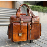 ساک چرم طبیعی دست دوز با چرم طبیعی همراه با چرخ و تراولی برای سفری راحت